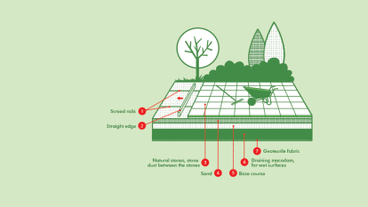 - Spread out the macadam. The macadam course should be about 5 cm thick. Level the surface with a rake.